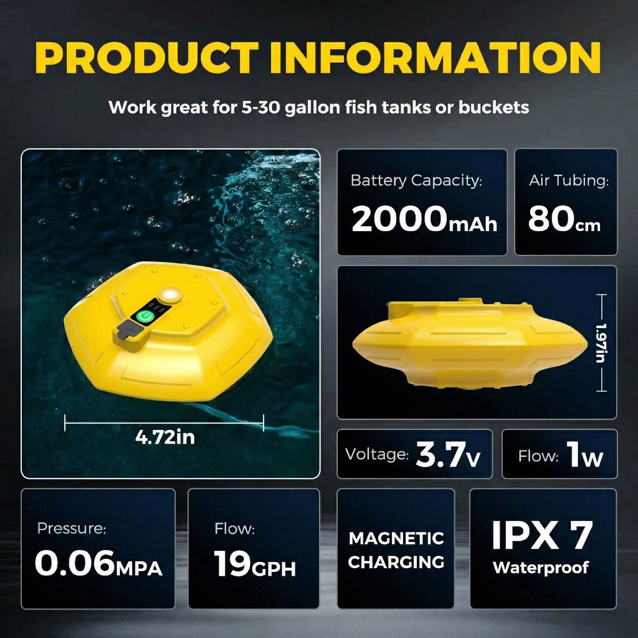 ćThoughtful Usage GuidancećFor supplemental aeration onlyānot a substitute for proper fish care, adequate water volume, or temperature management. Monitor bait/fish regularly; this device supports oxygenation but cannot guarantee survival. Keep away from children. Charge only when completely dry; do not operate while charging. Follow all local fishing regulations regarding bait transport and use.